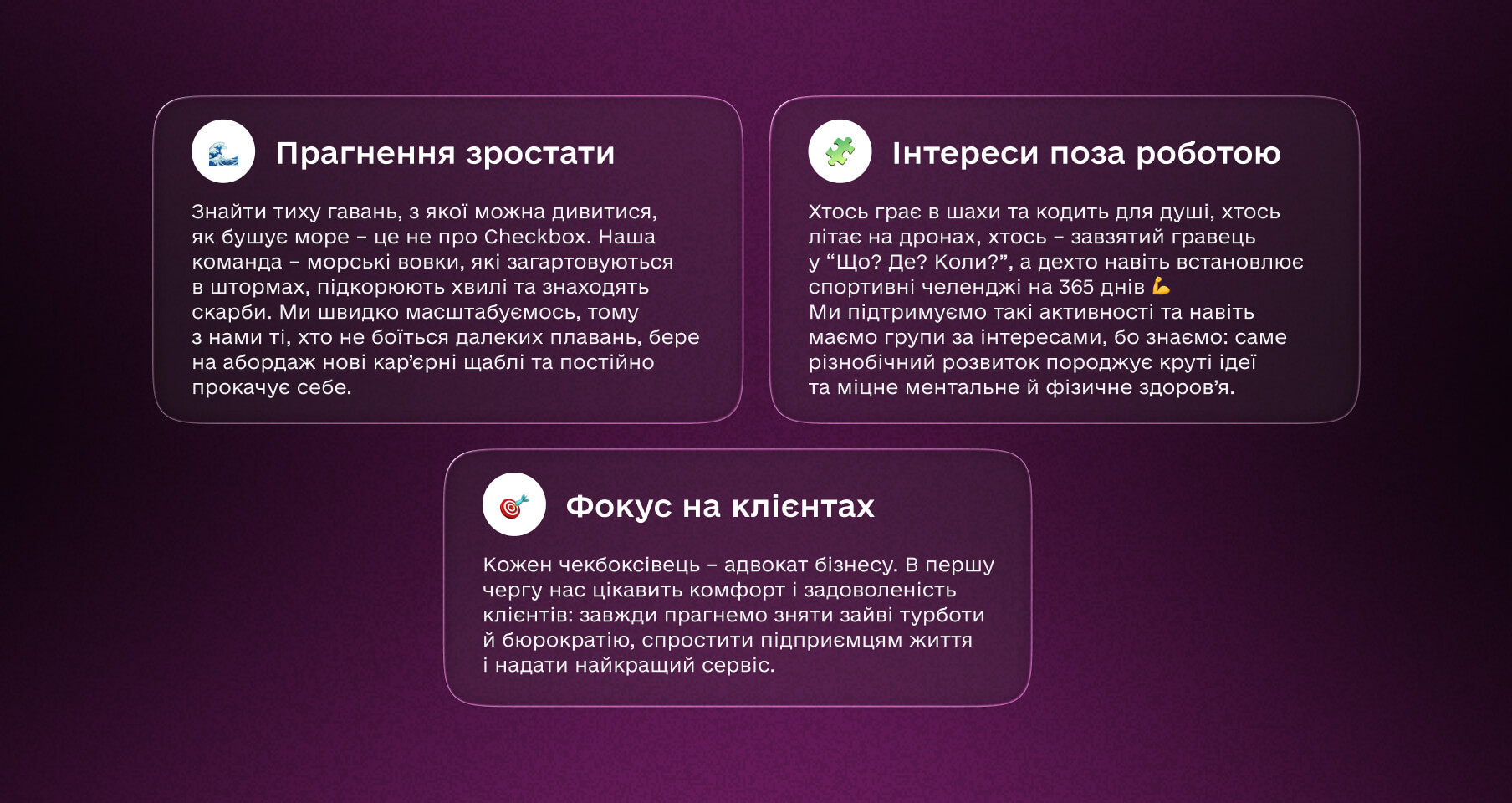 Наразі Checkbox потрібне підсилення у команду бренд-маркетингу: ті, кому цікаво генерувати ідеї, створювати контент, формувати стиль, працювати з комунікаціями та допомагати робити бренд впізнаваним.