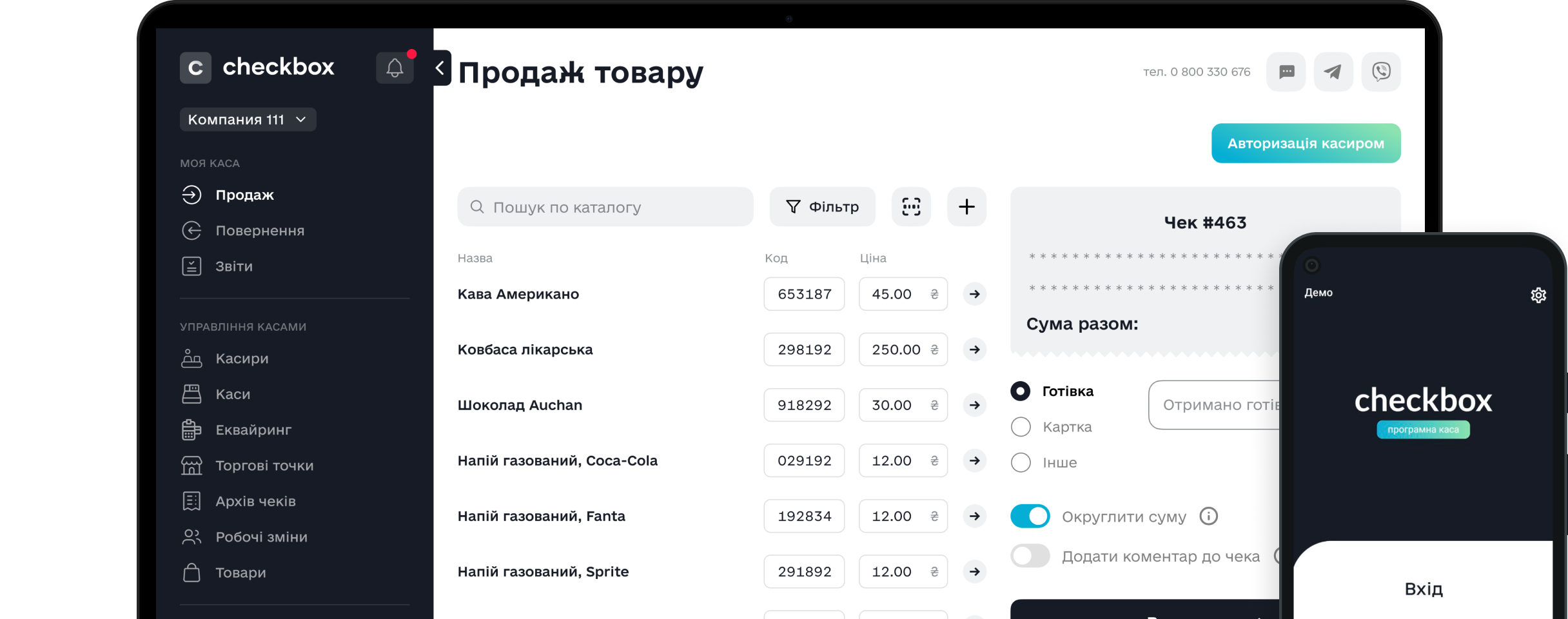 Відкрийте касову зміну, додайте товари, оберіть спосіб оплати, друкуйте або надсилайте чек.