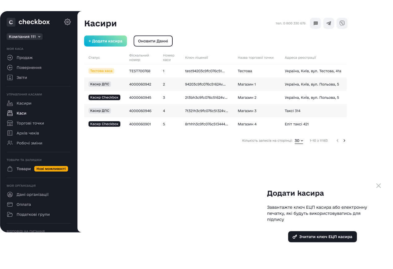 Внесіть дані вашої торгової точки, додайте касу та ключ ЕЦП касира. Система автоматично підтяне усі данні з ключа ЕЦП власника.